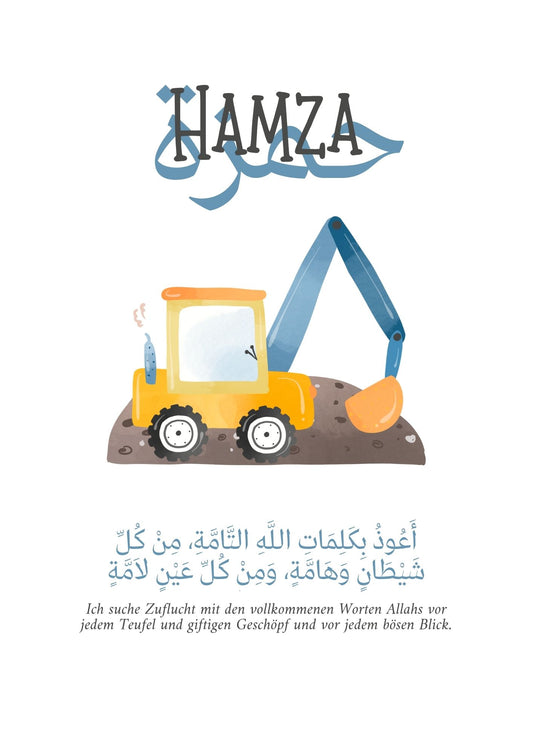 Kinderposter mit Bagger und Schutzdua für Jungs