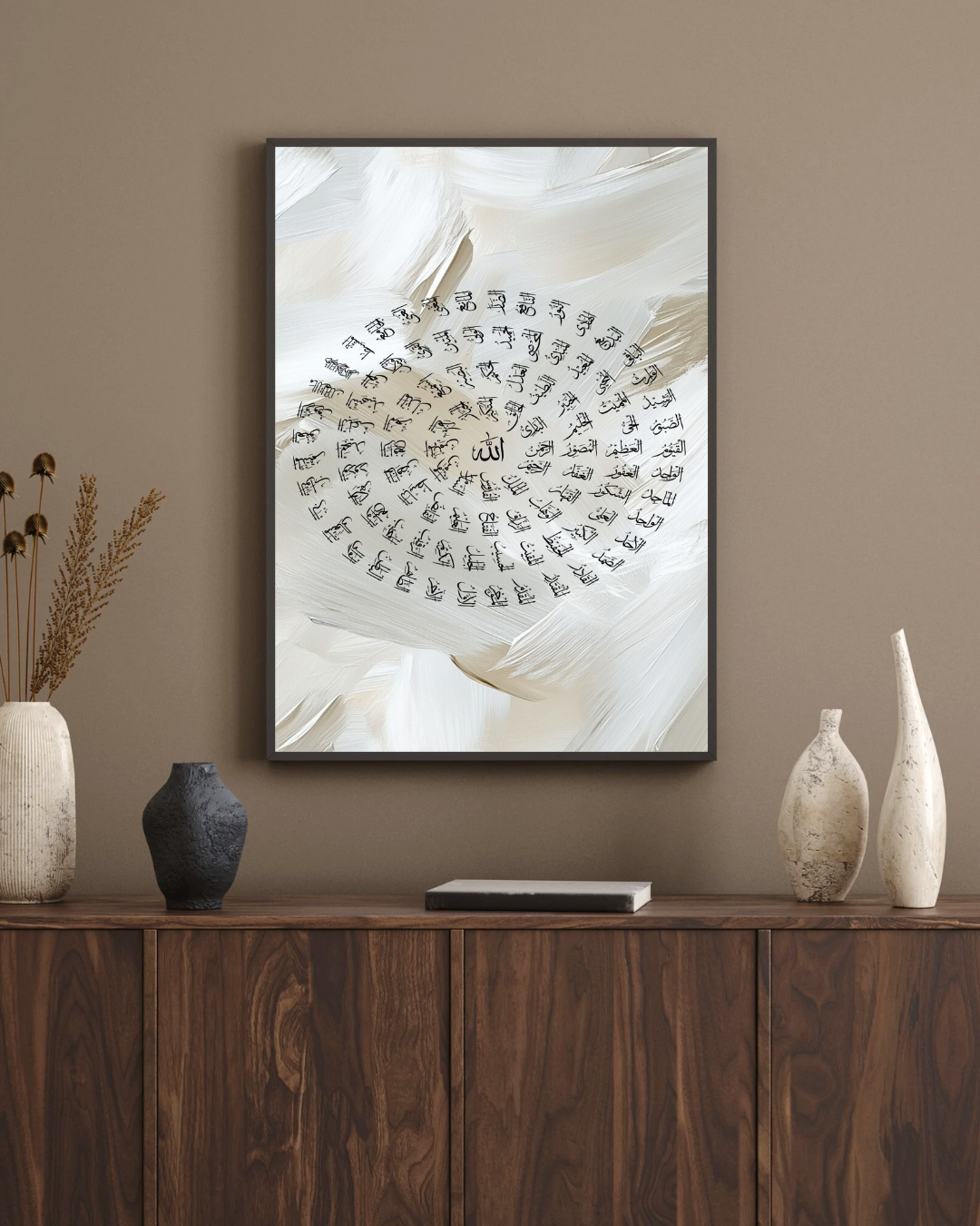 Dieses abstrakte Poster mit den 99 Namen von Allah ist perfekt geeignet als Dekoration für Dein Eigenheim oder auch als Geschenk für Deine Liebsten.