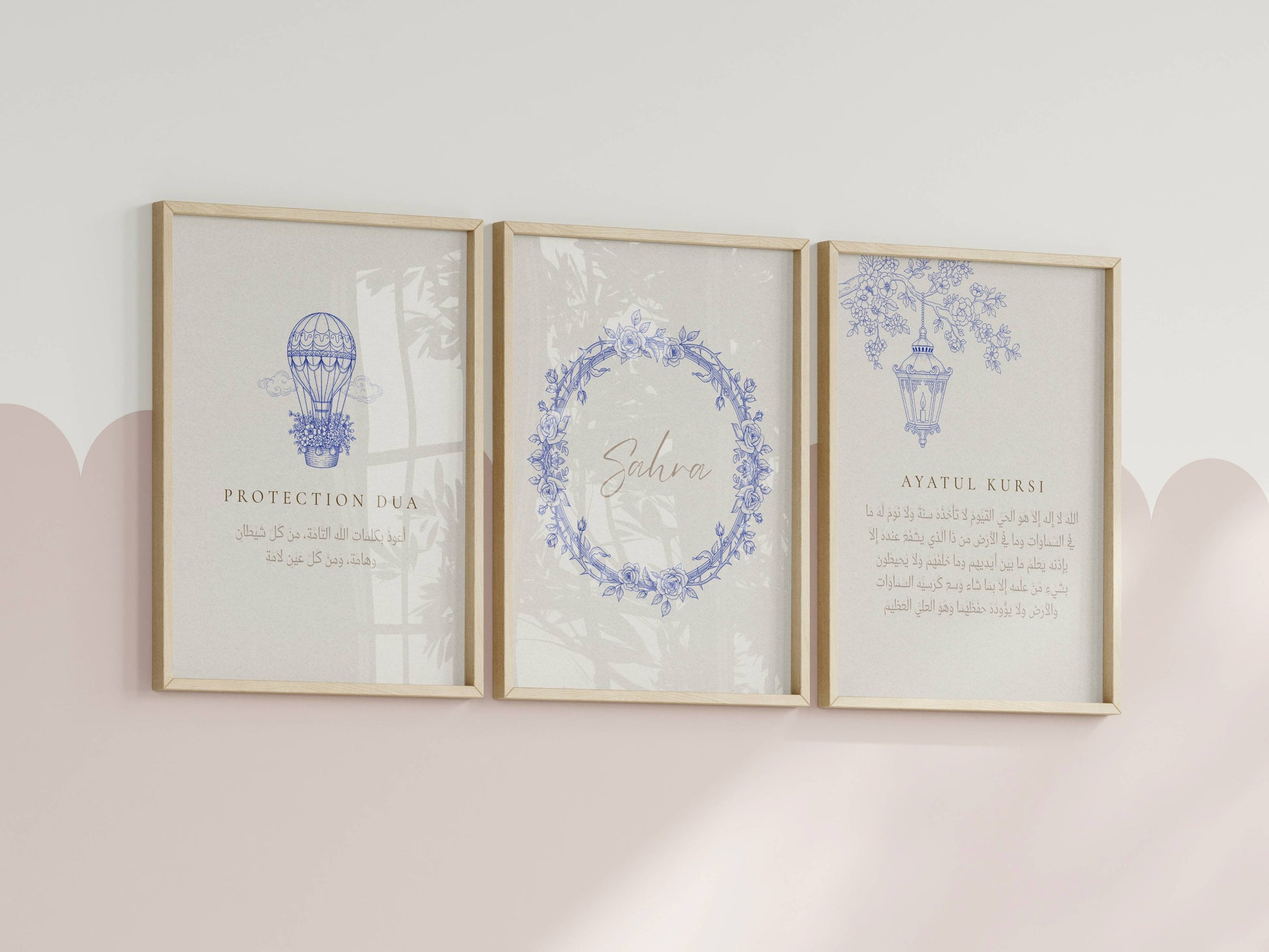 Dieses süße Posterset in blau-beige mit der Ayatul Kursi und einer Schutzdua für Mädchen wird kleine Herzensmenschen sehr freuen und ihren Zimmern einen Charme verleihen. Kahle und langweilige Wände werden mit diesem Set an Stil gewinnen. Mir ist es sehr wichtig, bedeutungsvolle Poster zu erstellen, die dein Zuhause mit islamischen Werten bedecken werden.
