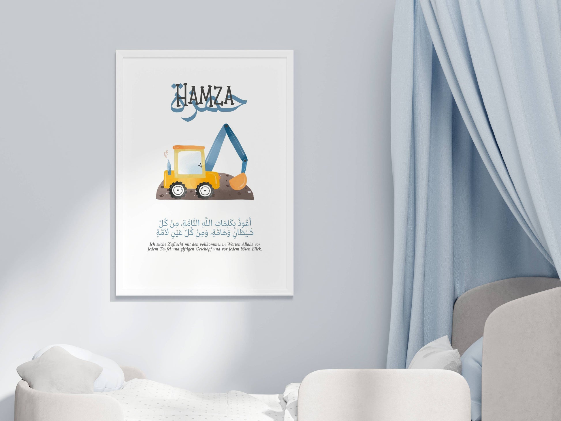 Dieses Baggerposter mit dem Namen des Kindes und einer Schutzsurah ist das perfekte Geschenk für kleine Herzensmenschen und eine sehr gute Ergänzung für ihre Kinderzimmer.