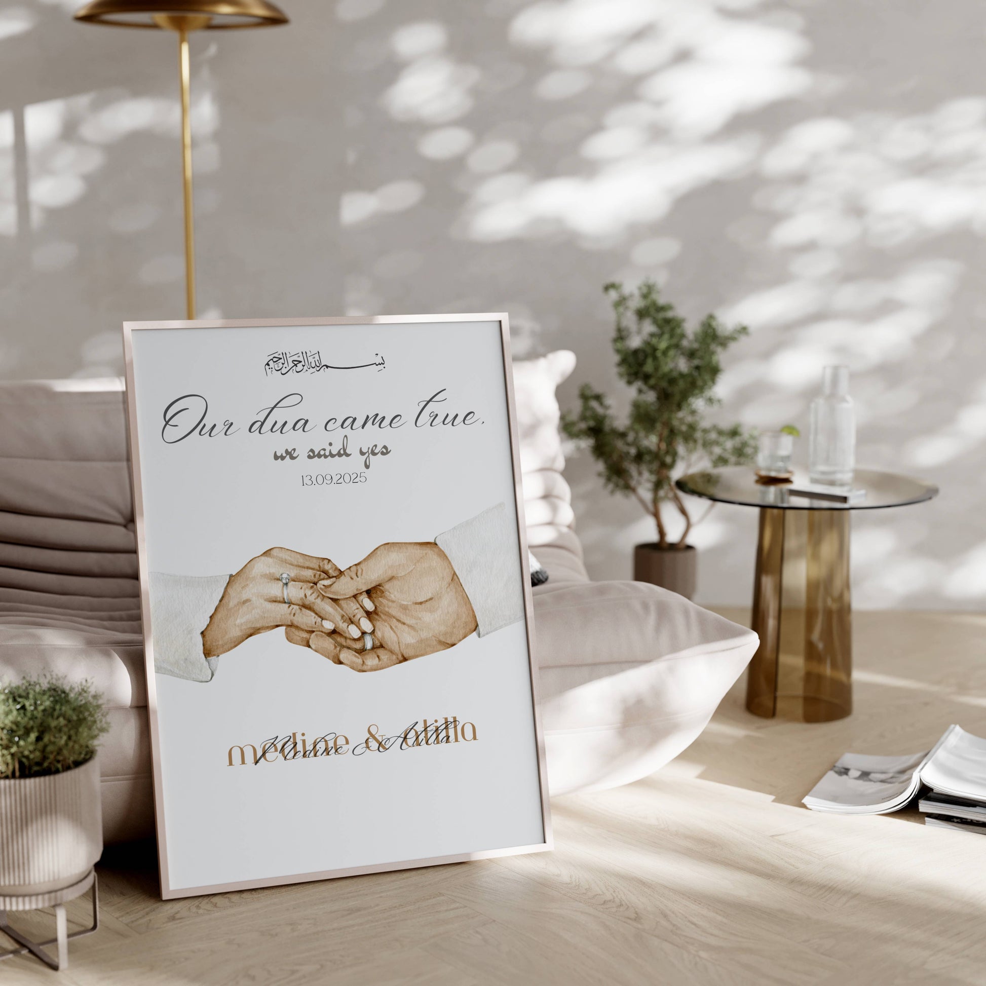 Du wurdest von Deinen Liebsten zur standesamtlichen Trauung eingeladen und benötigst ein bedeutungsvolles Geschenk? Dieses islamische Händeposter mit Personalisierung ist perfekt dafür geeignet und wird immer ein Eye-Catcher bleiben.