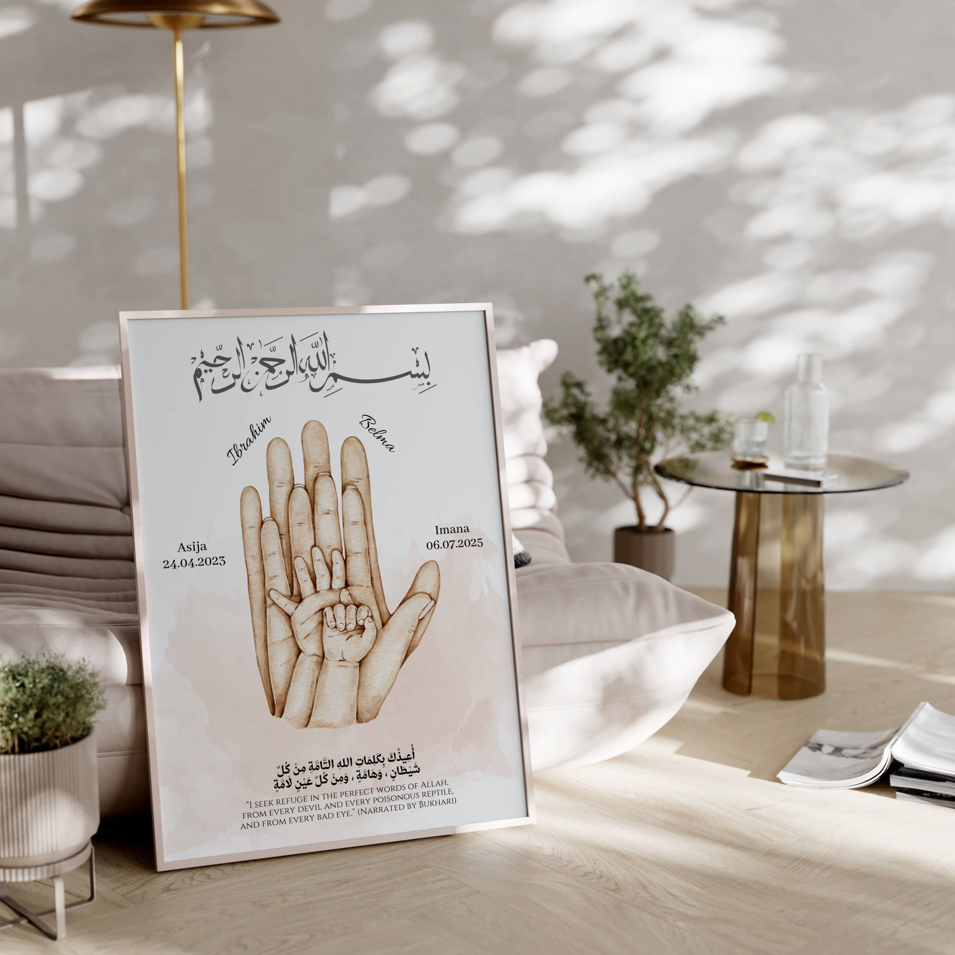 Deine Liebste hat Geburtstag und Du benötigst ein bedeutungsvolles Geschenk? Dieses islamische Familienposter mit Personalisierung ist perfekt dafür geeignet und wird immer ein Eye-Catcher bleiben. Wichtig: Es sind bis zu 5 Kinderhände möglich.