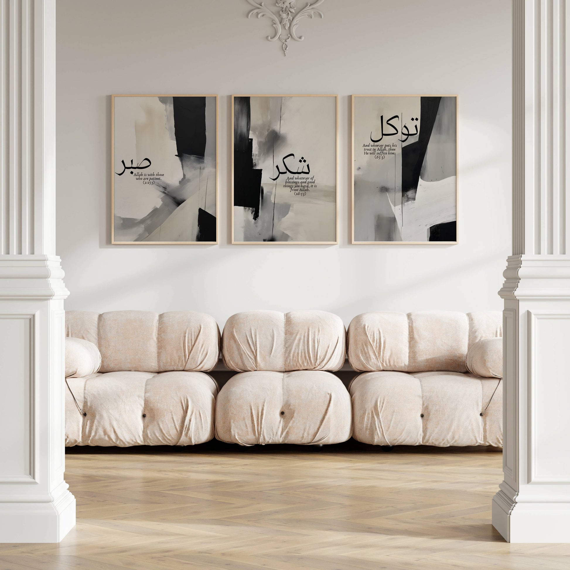 Sabr, Shukr, Tawakkul Posterset mit grau-schwarzem Hintergrund
