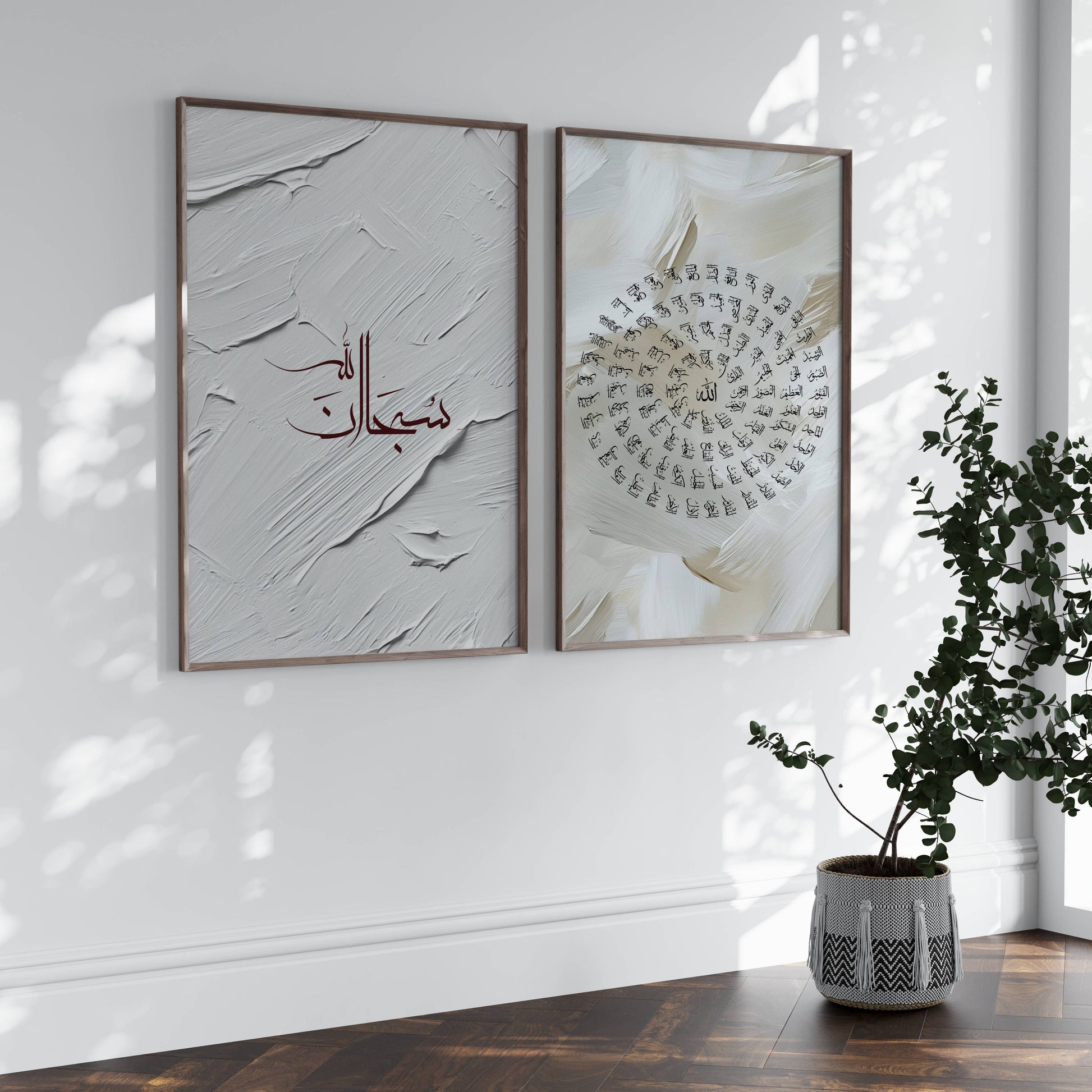 Ein edles Posterset mit Subhanallah in arabischer Kalligraphie und die 99 Namen von Allah als Ergänzung für das Eigenheim oder auch als Geschenk für die Liebsten.