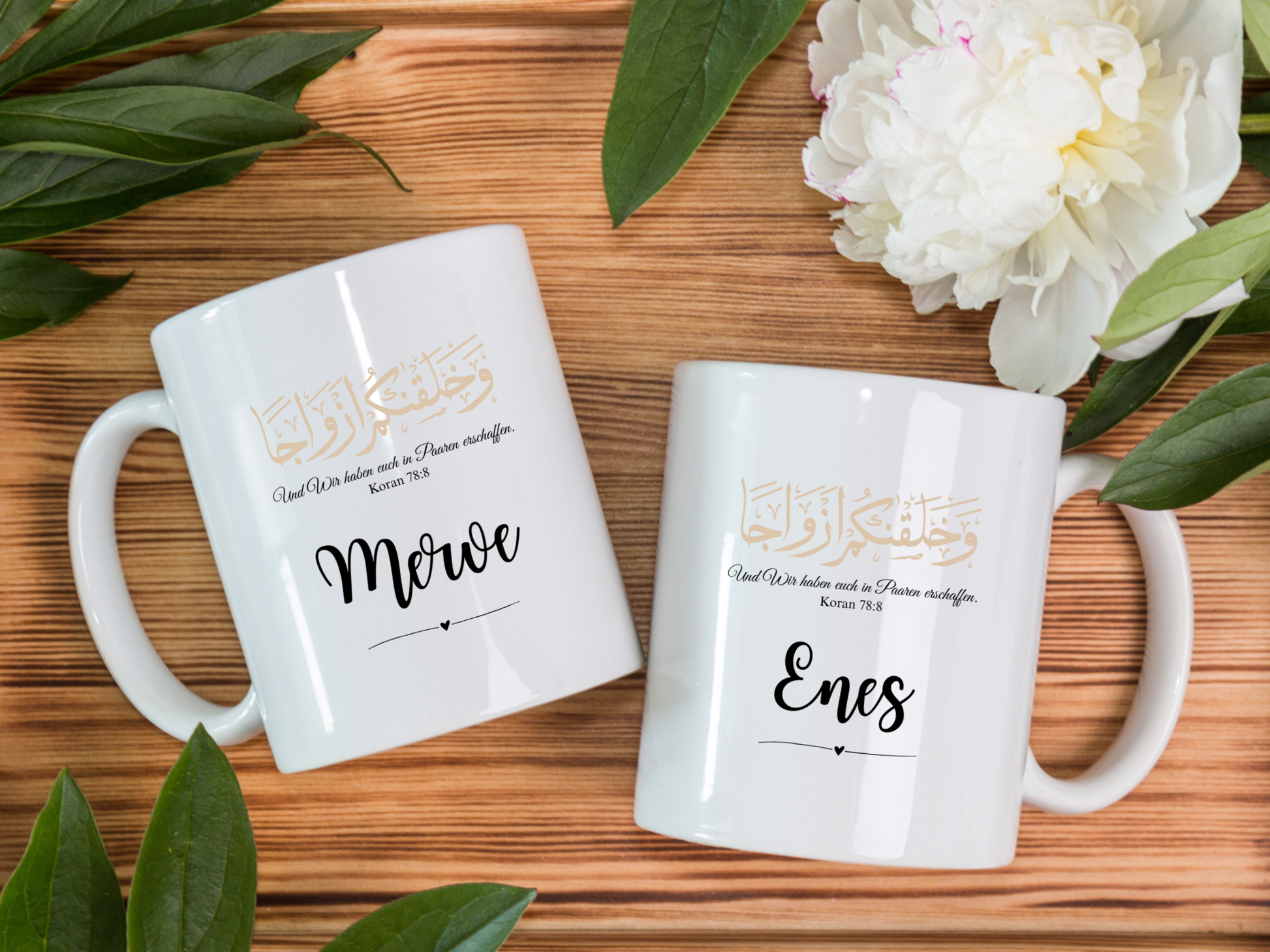 Du möchtest Deine Liebsten überraschen und ihnen eine Freude bereiten, weil sie Geburtstag haben oder aus einem anderen besonderen Anlass? Diese einzigartige personalisierte Tasse mit dem Koranvers Und Wir haben euch in Paaren erschaffen wird ihr Liebling beim Tee- oder Kaffeetrinken. Diese Pärchen Tasse kann auch perfekt als Nikah Geschenk genutzt werden.